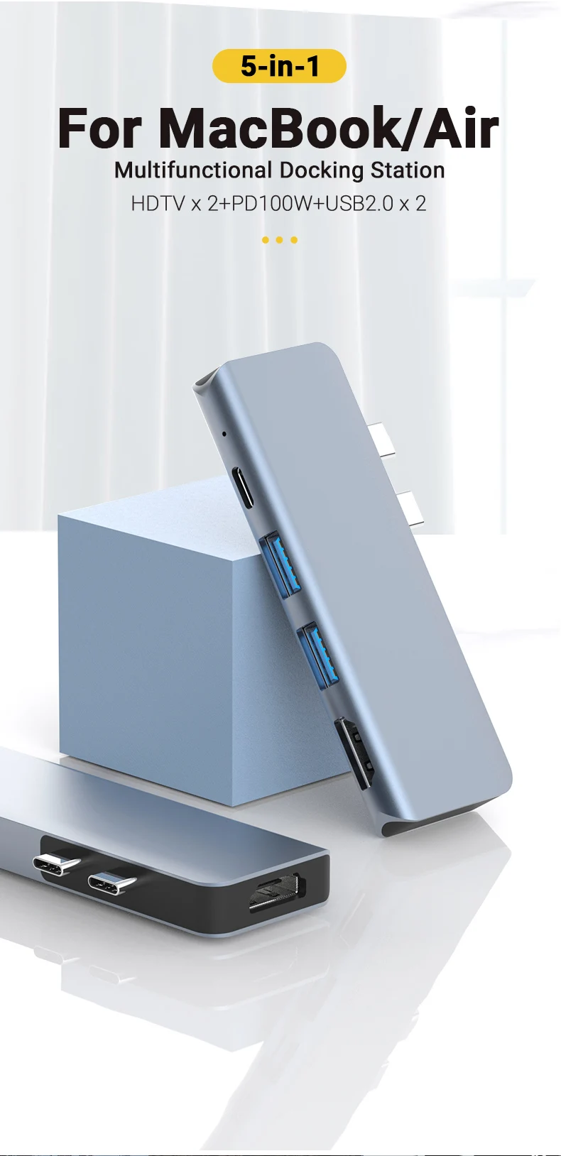 5-in-1 USB-C Hub Laptop Docking Station USB C to Dual HDMI Adapter with 4K 60Hz HDMI*2, PD100W , USB2.0 Port for MacBook Pro/Air