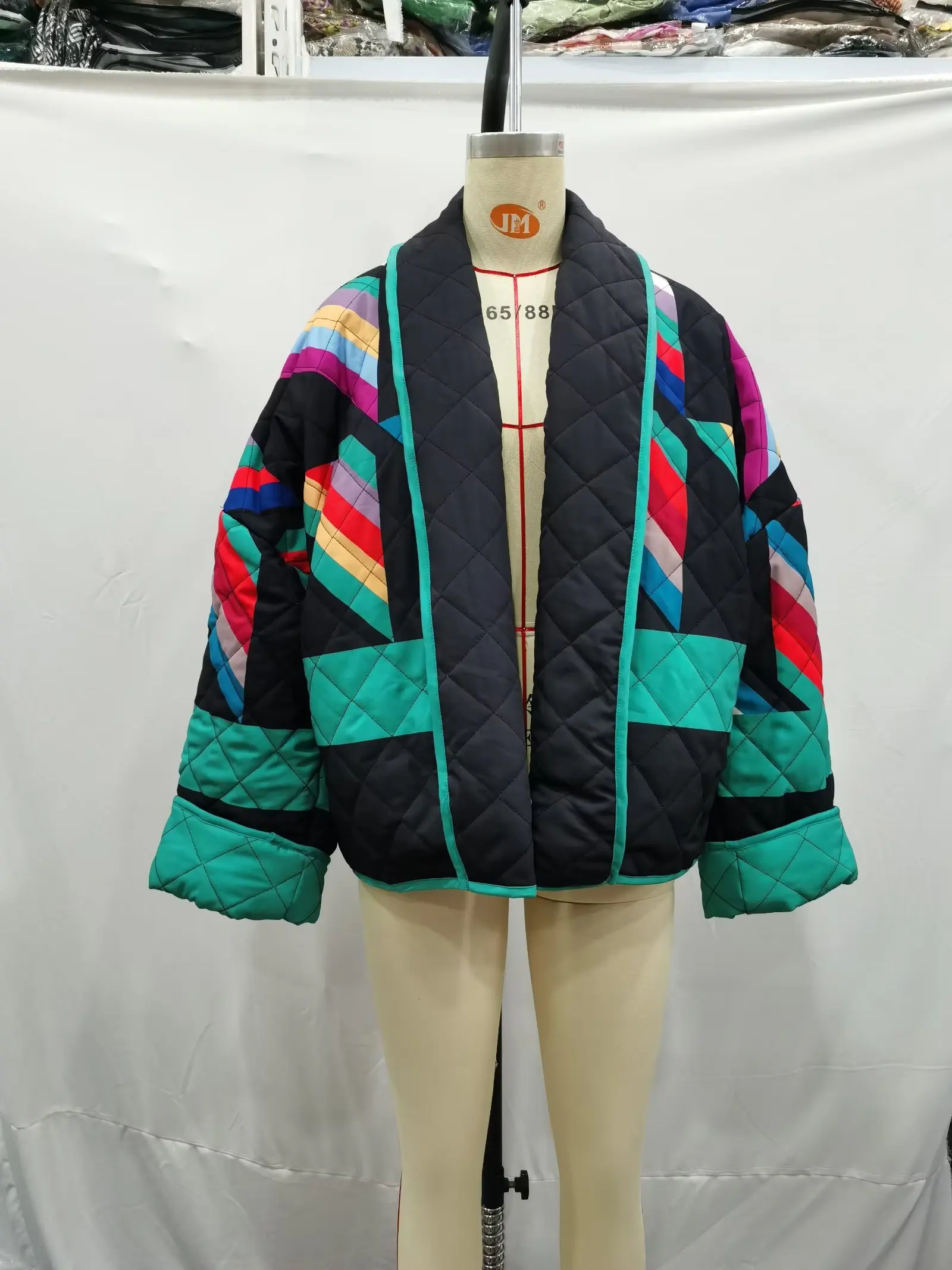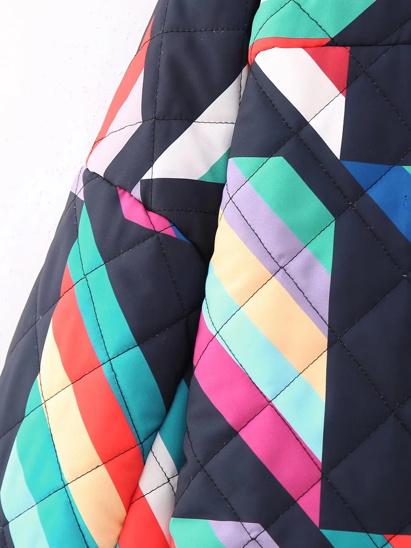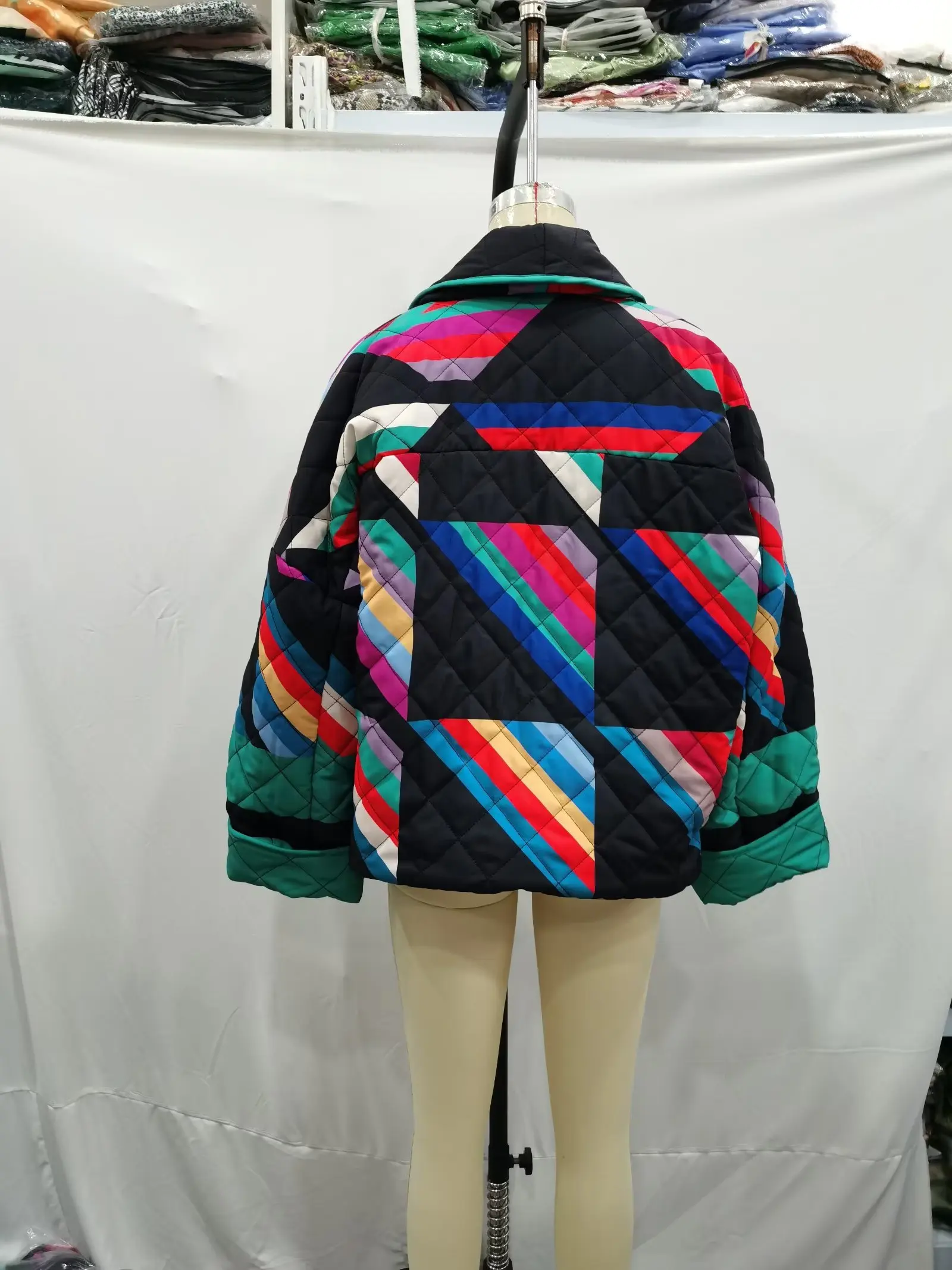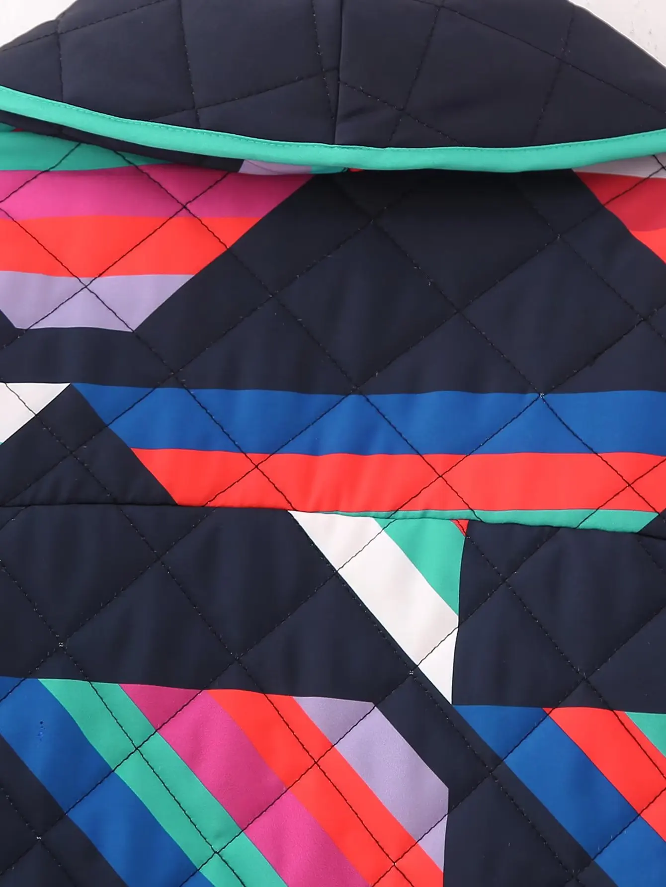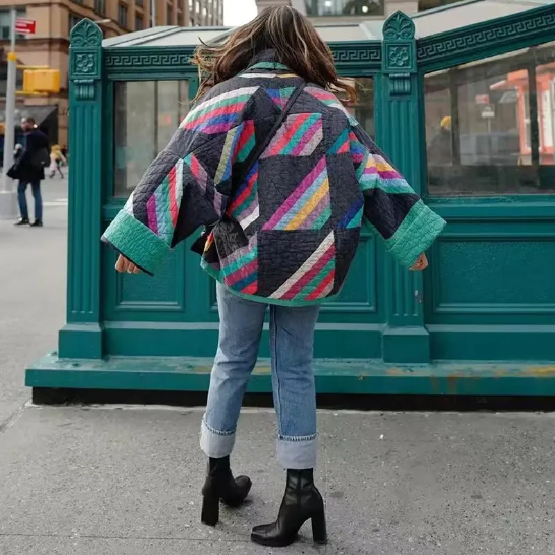 Winter Black Green Geometric Plaid Print Lapel Quilted Coat Ethnic Women Quilting Full Sleeve Warm Loose Jacket Retro Outerwear