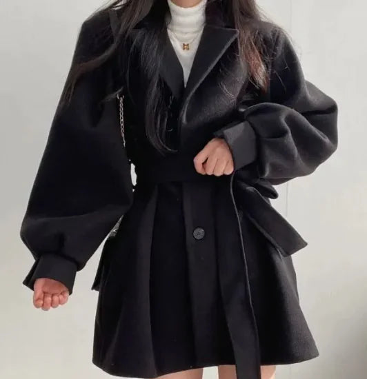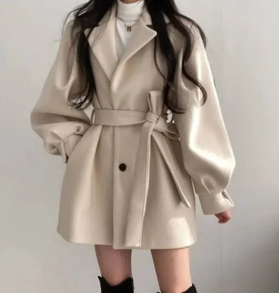 A stylish mid-length woolen coat with a suit collar, designed for comfort and warmth. This loose-fitting coat is perfect for cooler weather, offering a chic and versatile addition to any wardrobe.